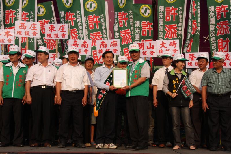 許添財11日下午由佳里鎮後援會成立後,繼續飛奔往故鄉官田鄉,主持成立官田鄉後援會。官田鄉後援會會長由現任鄉長陳成文擔任,官田鄉各村的村長及農會總幹事林正容,都上台為市長站台。現場鄉親逾千人都出來為許添財加油打氣,當選聲喊得震天嘎響。許添財以官田鄉出了台灣人的總統為例,表示相信官田一定也會誕生第一任大台南市長。