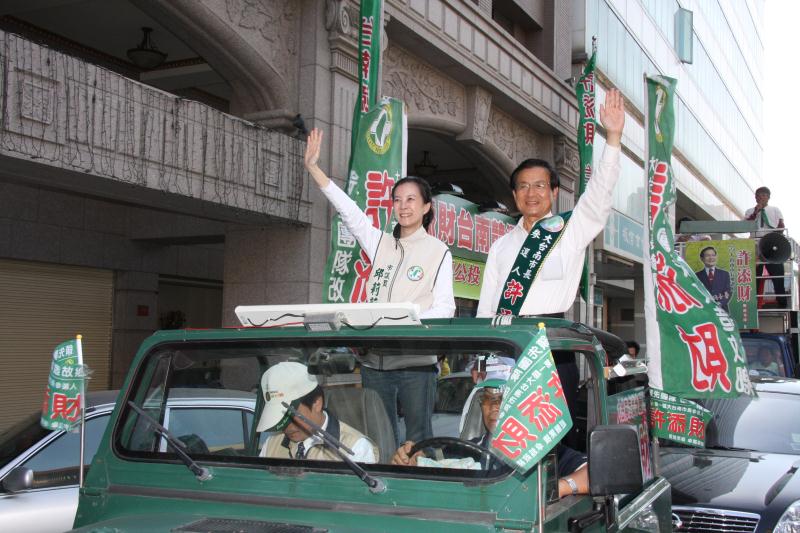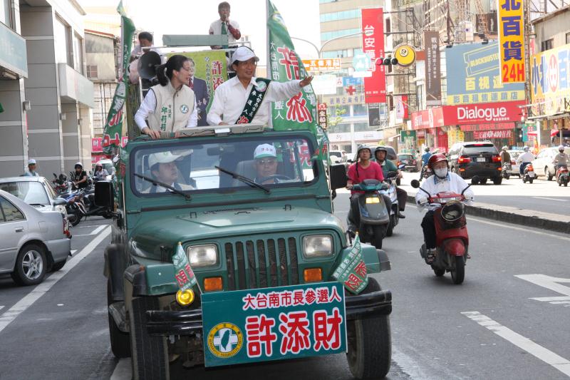 市長許添財在市議員邱莉莉陪同下,在台南市中西區及安平區掃街拜票