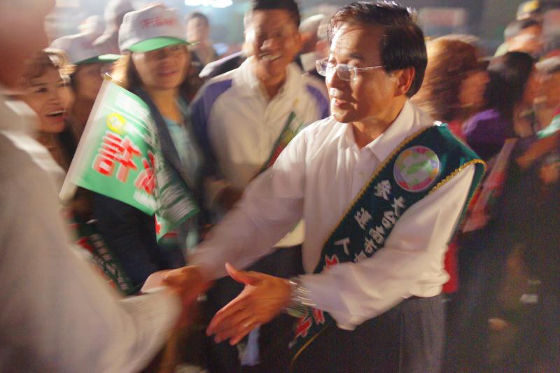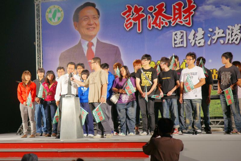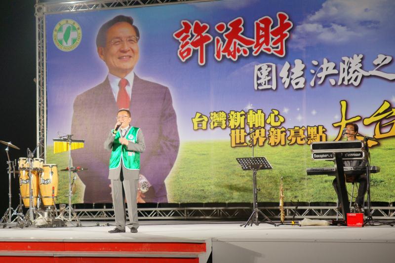 直轄市市長候選人許添財在望春風的音樂聲中走上台,在場上萬名的支持者不斷地揮舞旗幟,給許添財加油打氣與鼓勵,高喊許添財當選之聲不絕於耳,主持人介紹許添財為全國施政滿意度第一名,台南縣子弟,阿扁唯一支持的大台南直轄市長候選人。