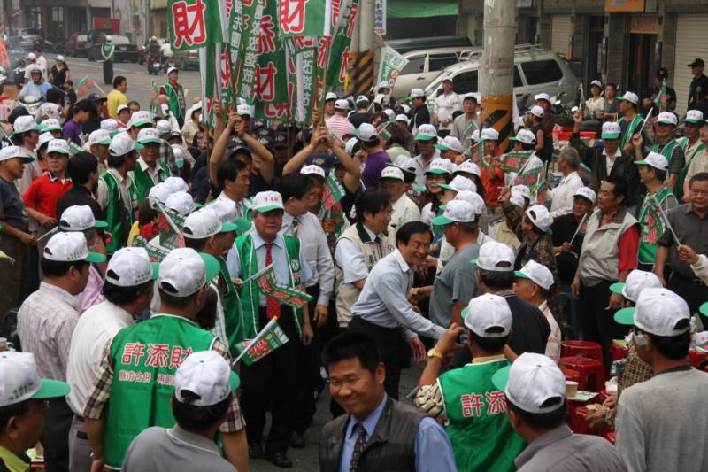 許添財強調五月初民調要靠親朋好友幫忙,他希望透過成立後援會,從基層深入家庭,透過親戚朋友廣為宣傳,許添財拜託大家共同打拼,他以一句好記的『支持許添財,家家戶戶添丁大發財』。