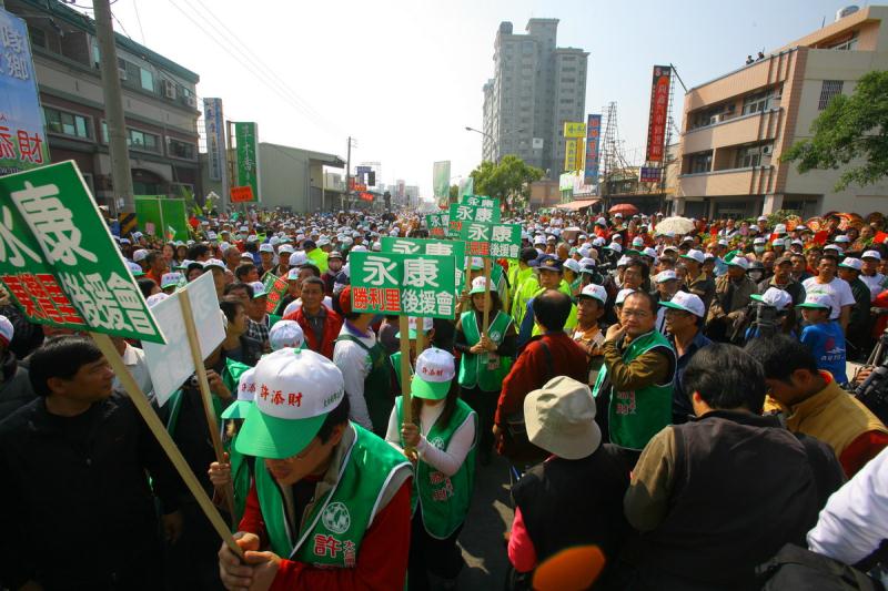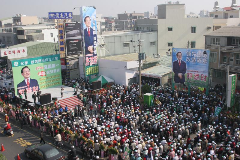 這可能是競選2012年總統大選才能看到的競選人氣場面!17日上午的臺南永康市永大路二段416號前,從大灣三街向南到大灣一街綿延三個街口約一公里長的街道,被近3萬名的人潮擠得水洩不通、盛況空前!熱情支持許添財參選大臺南市長的鄉親們聚集在競選總部前,參加許添財市長「永康競選總部成立大會」。前副總統呂秀蓮、立委陳亭妃、蔡同榮、管碧玲、余天;還有雲林縣新出爐的立委劉建國、雲林縣縣長蘇治芬、民進黨前秘書長陳師孟、前總統府副秘書長長陳其邁、名嘴吳國棟都前來為市長站台致詞推薦。下午市長並親自站上宣傳車,邀請永康及鄰近鄉鎮的鄉親們有空到永康競選總部奉茶,為台南縣出身的市長全力相挺!